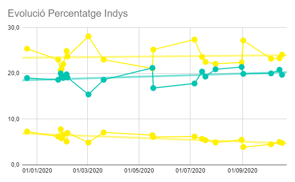 I com a darrer apunt, un gràfic amb percentatge de vot de totes les enquestes al Parlament d’aquest 2020 dels tres partits indepes, on es poden observar tendències:
