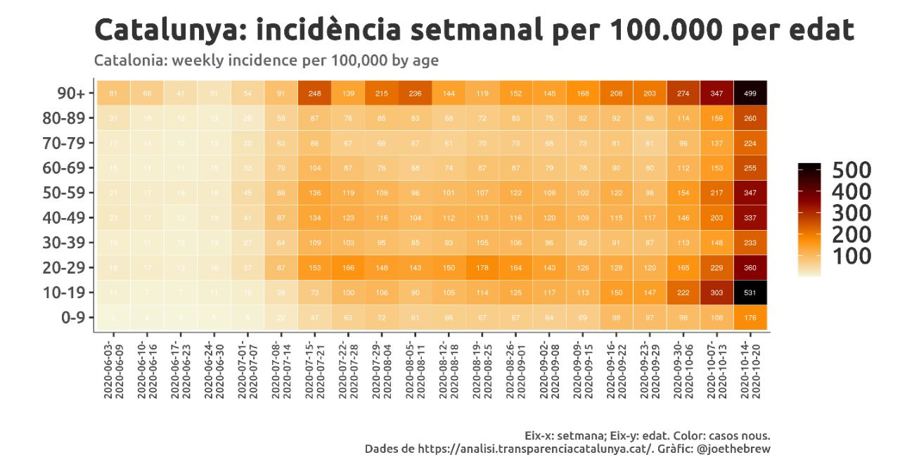 El gràfic anterior mostra com els contagis han anat mutant cap a edats més baixes. Els joves no són culpables de tot, com tampoc són els avis, simplement són els que en els darrers temps han aconseguit mantenir una vida social més activa.