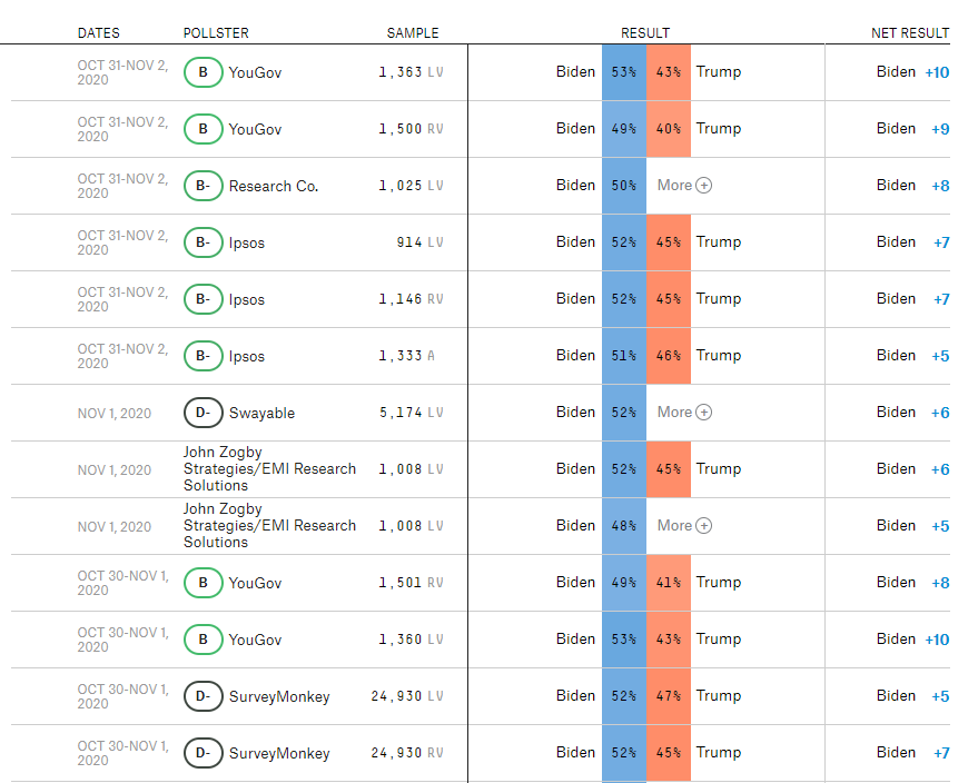 No ben bé, el dia abans d’ara fa quatre anys les enquestes a favor de Hillary estaven entre 1-3 punts per sobre de Trump, i en la majoria dels estats disputats empat tècnic.