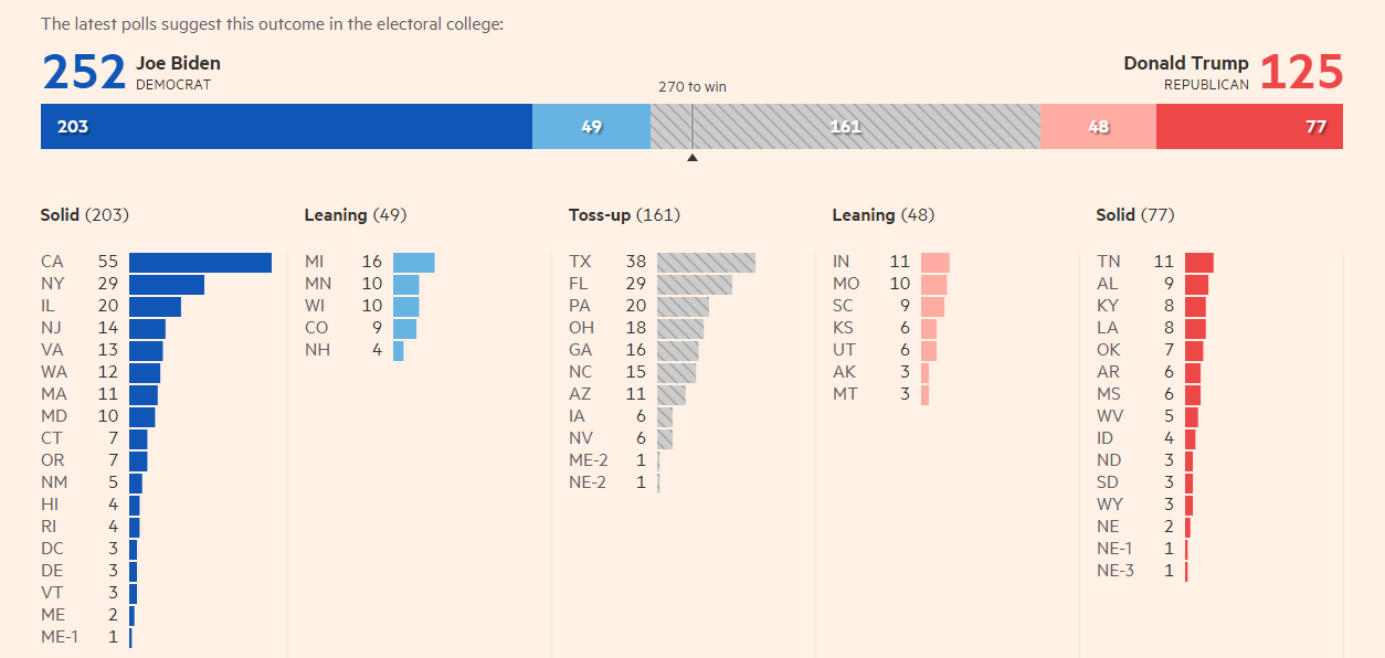 Per exemple, a Califòrnia l’enquesta més faborable a Trump li dona un 25 punts menys de vot que a Biden. Per tant, Califòrnia ja sabem perfectament que serà per Biden.