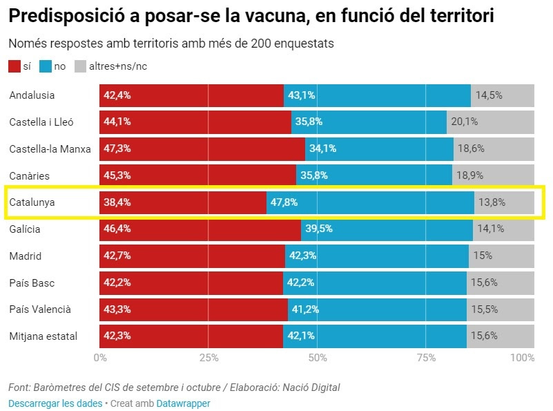 Un estudi sociòlogic recent fet pel Centre d’Investigacions Sociològiques (CIS) diu que el 47,8% dels catalans no estarien predisposats a administrar-se la vacuna per un 38,4% que si ho estaria i un 13,8% que encara no ho ha decidit.